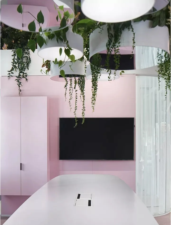 工作區(qū)采用中性色設(shè)計(jì),利于專(zhuān)注工作。淡粉色的走道是真正的情緒助推器,它喚起了員工之間的情感共鳴。精心布置的水源和雅致的燈光設(shè)計(jì)有助于帶來(lái)更愉悅的心情。熱帶壁紙與柔軟的沙發(fā)和小圓桌塑造了一個(gè)熱情洋溢的活力氛圍。
