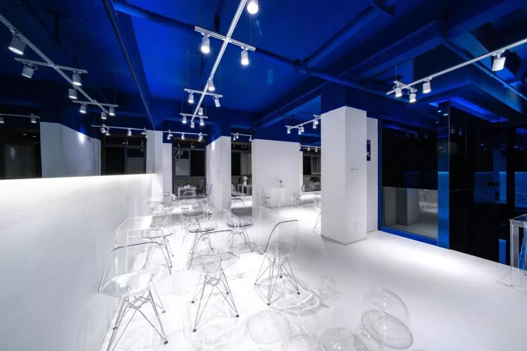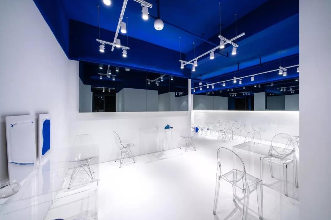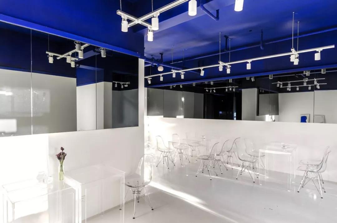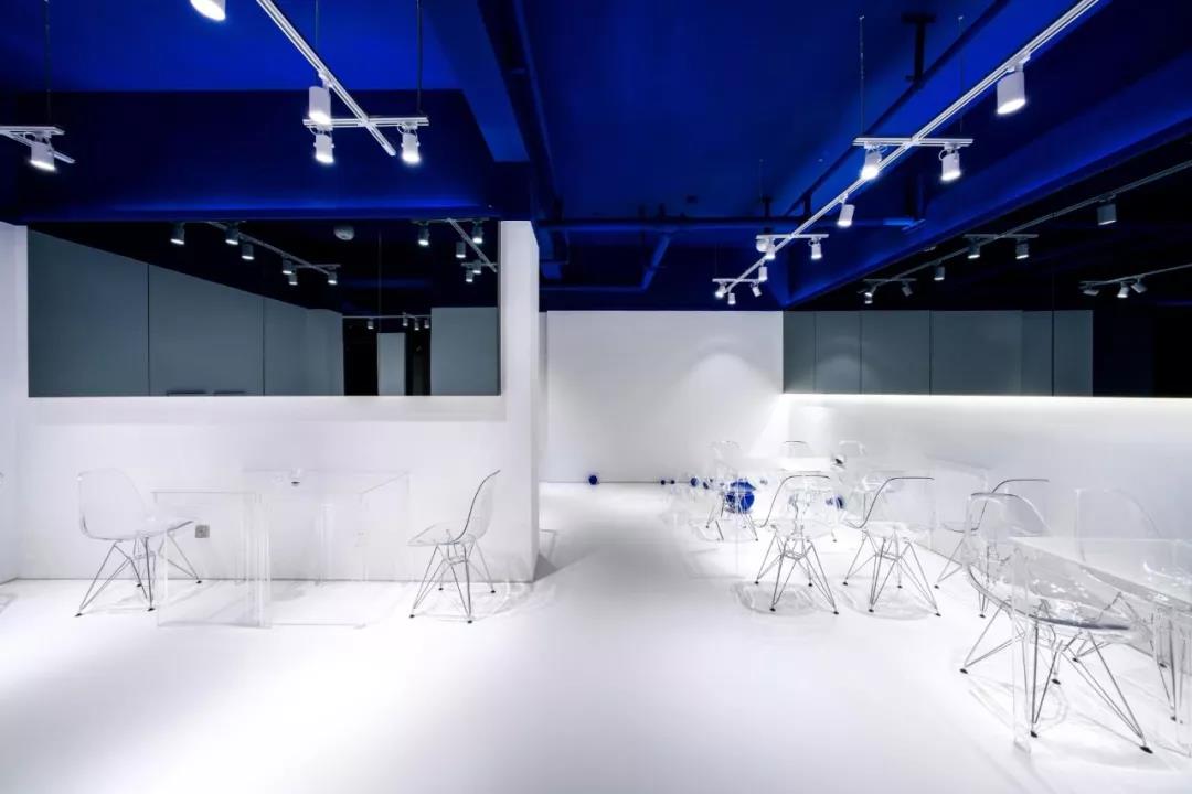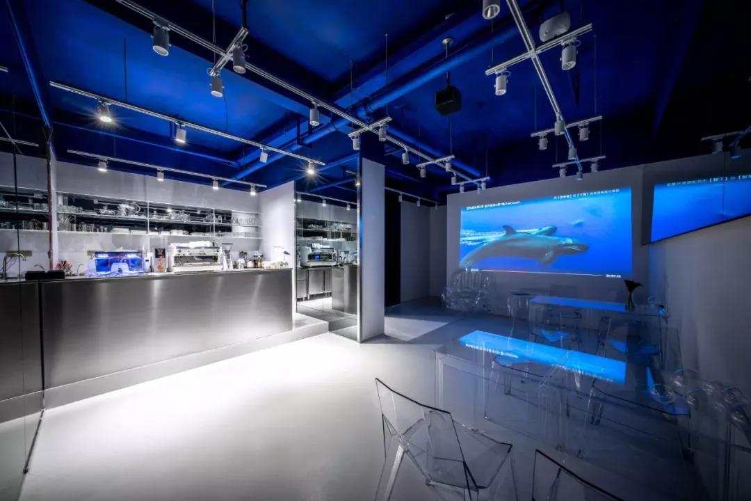 帶著這樣的邏輯,整個空間的設計就很明確了,拆除原有的吊頂,用涂料做成藍色的“天空”;下面的空間則使用帶有反射性/透明性的材料——鏡面、金屬、亞克力、塑料等,通過這種曖昧的委婉的,而非簡單粗暴的方式,讓深海的藍色充滿整個空間。