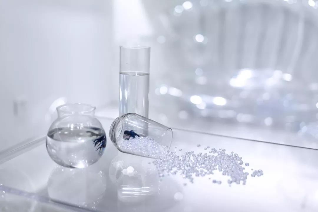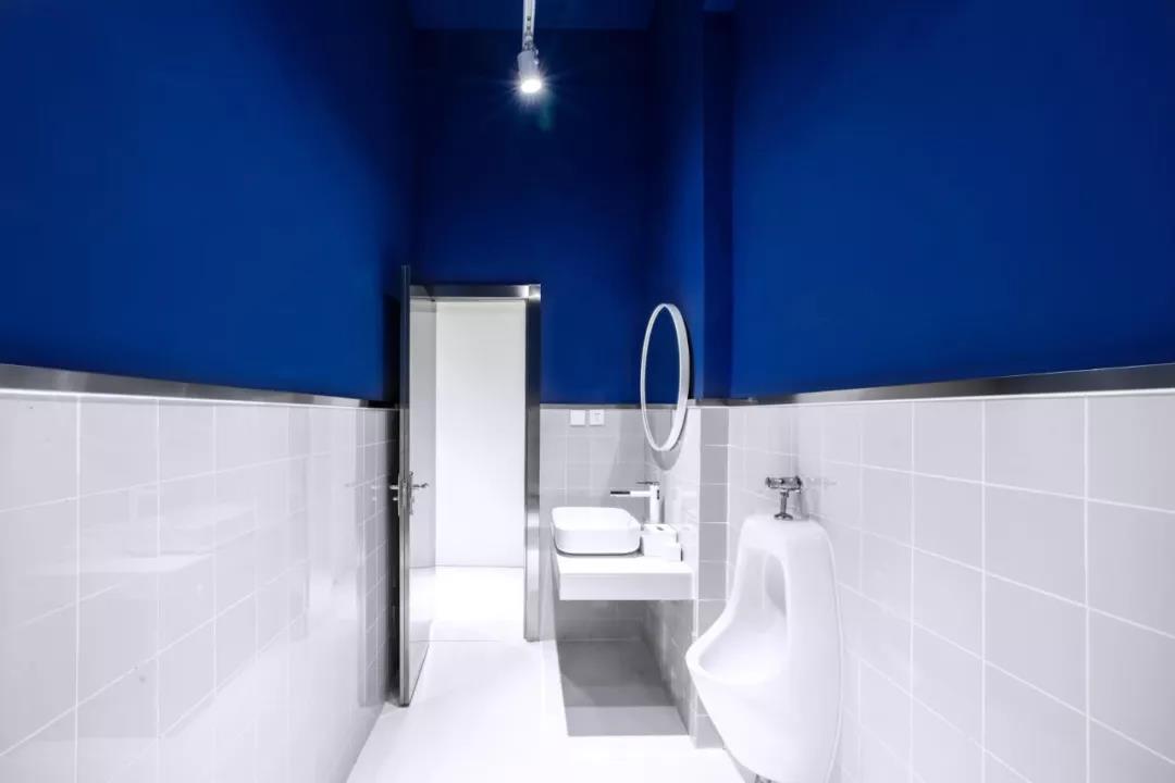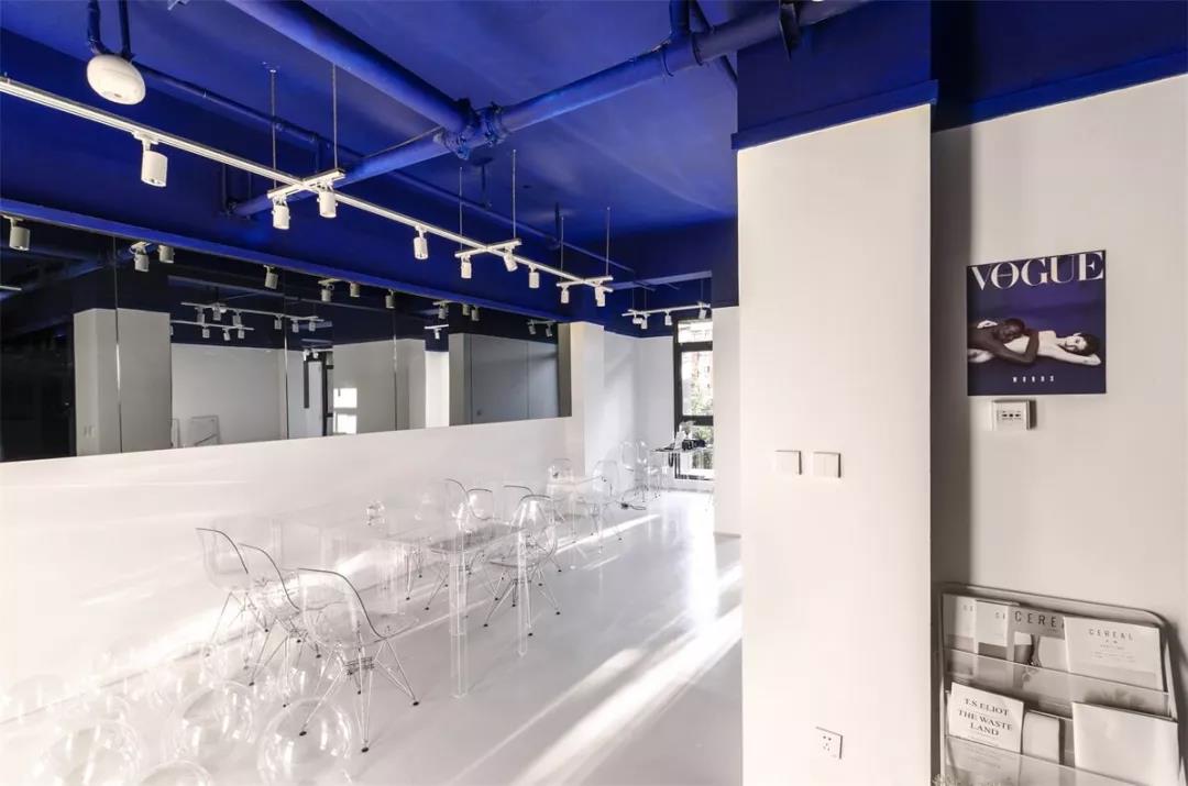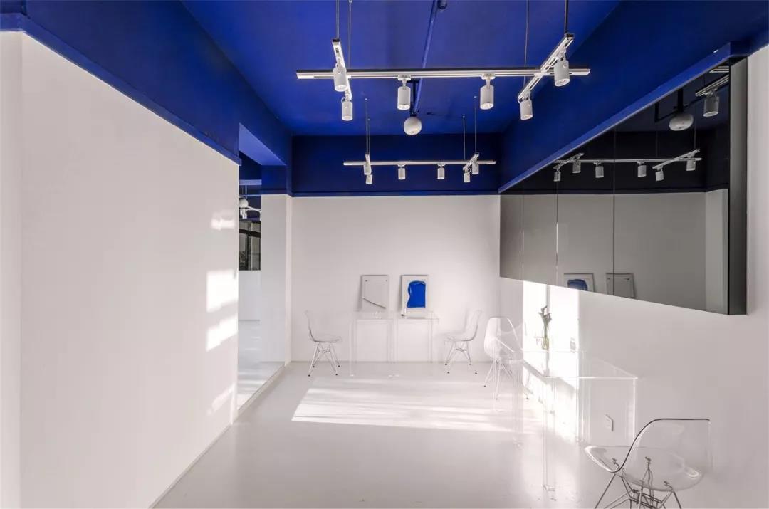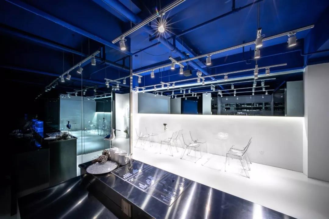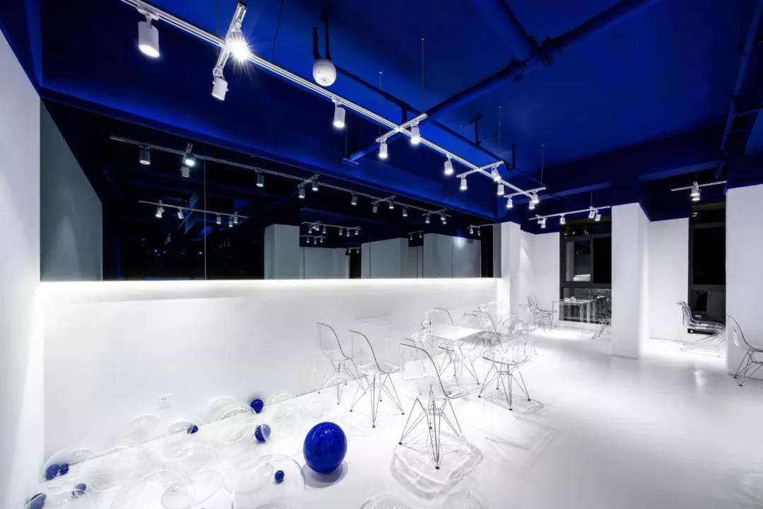 帶著這樣的邏輯,整個空間的設計就很明確了,拆除原有的吊頂,用涂料做成藍色的“天空”;下面的空間則使用帶有反射性/透明性的材料——鏡面、金屬、亞克力、塑料等,通過這種曖昧的委婉的,而非簡單粗暴的方式,讓深海的藍色充滿整個空間。