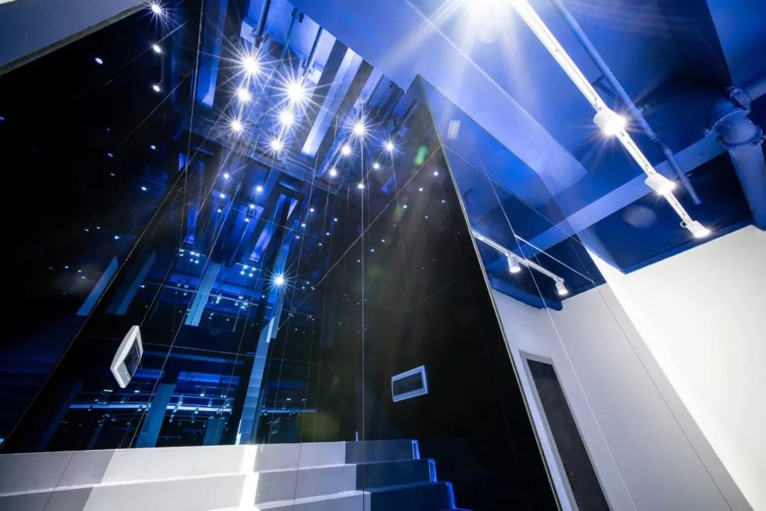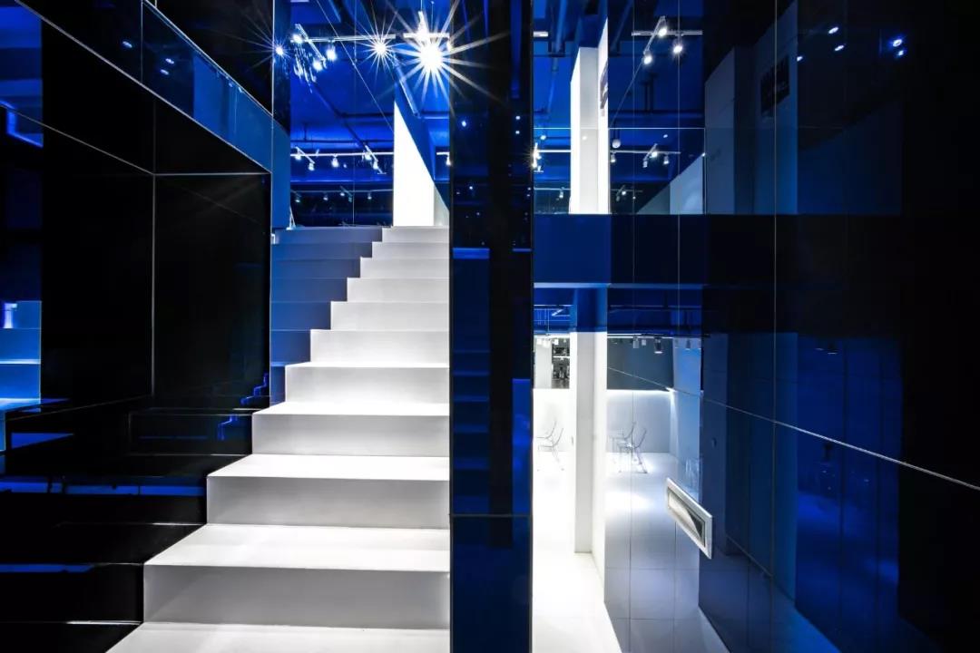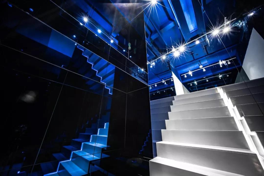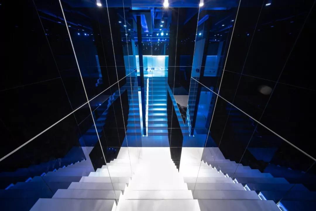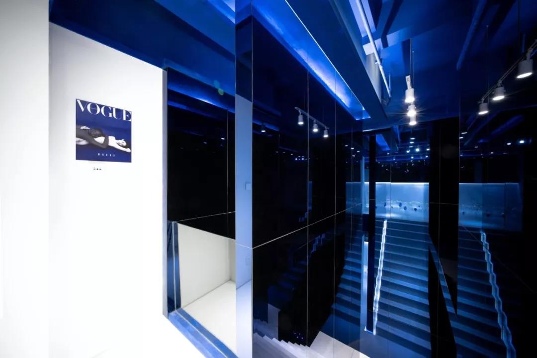 鏡面材質方面,大面積使用的玻璃鏡面增加了空間的延伸感和開闊性,而鏡面的安裝則在通過多層板固定在墻面,并且鏡面外邊框則通過多層板開暗槽暗藏了LED燈帶創(chuàng)造出鏡面懸浮在空中的效果。設計中出現(xiàn)了普通的灰鏡以及在樓梯空間部分為了強調反射效果而采用的藍鏡,樓梯空間的大面積鏡面配合不同地方的光源、以及藍色頂面不同層次的漫反射創(chuàng)造出一種夢幻的效果。