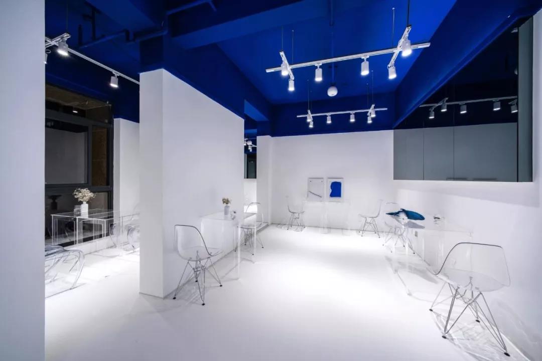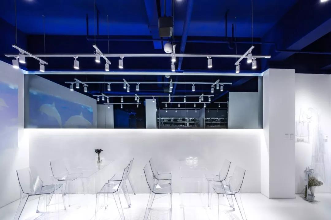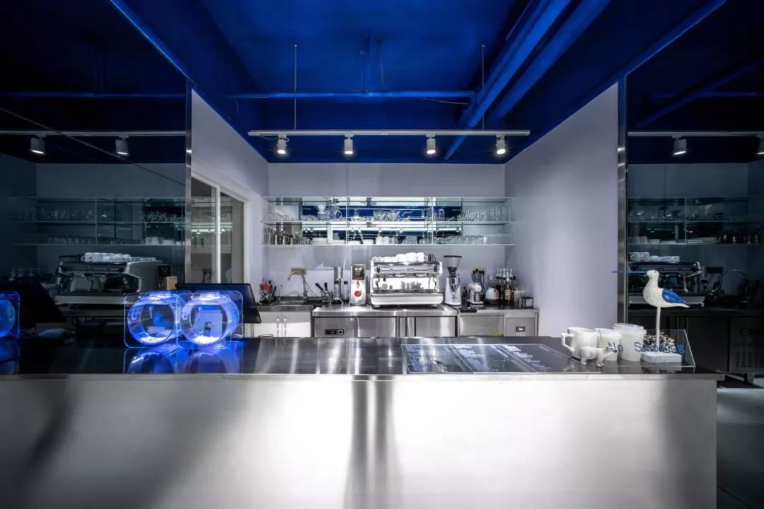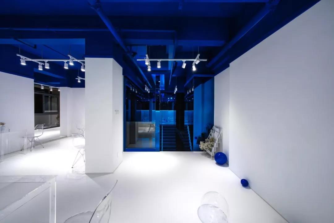 因為業(yè)主確定咖啡館名字叫“深海”,所以設計師花了心思去思考到底“深海”是什么。不同于常規(guī)的思考和正常做設計時搜索參考圖片的是,往往這樣的設計都是帶有藍色的空間,但“深海”這個名稱所帶來的概念思考卻是,為什么深海是藍色的?當透過這層思考方式去搜索就會發(fā)現(xiàn),海水之所以是藍色,是因為天空是藍色的(原理就不多說了),水體(空間)是透明的,所以深海的藍色是光和材料本身所產生的而非通過“設計”創(chuàng)造的。