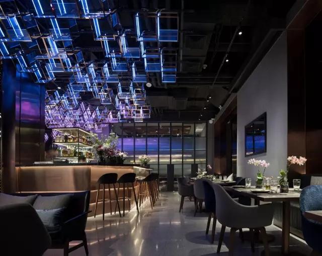 attabj意大利餐廳最美之處便是天頂上的藝術燈群,設計師通過抽象化、藝術化的手法,將這一感官體驗濃縮為空間當中的一組裝置,透明亞克力單元體如同酒杯內(nèi)的冰塊,而不斷變幻的LED燈光就像是色彩斑斕的酒體,兩者相互反應形成夢幻迷離的光影效果。