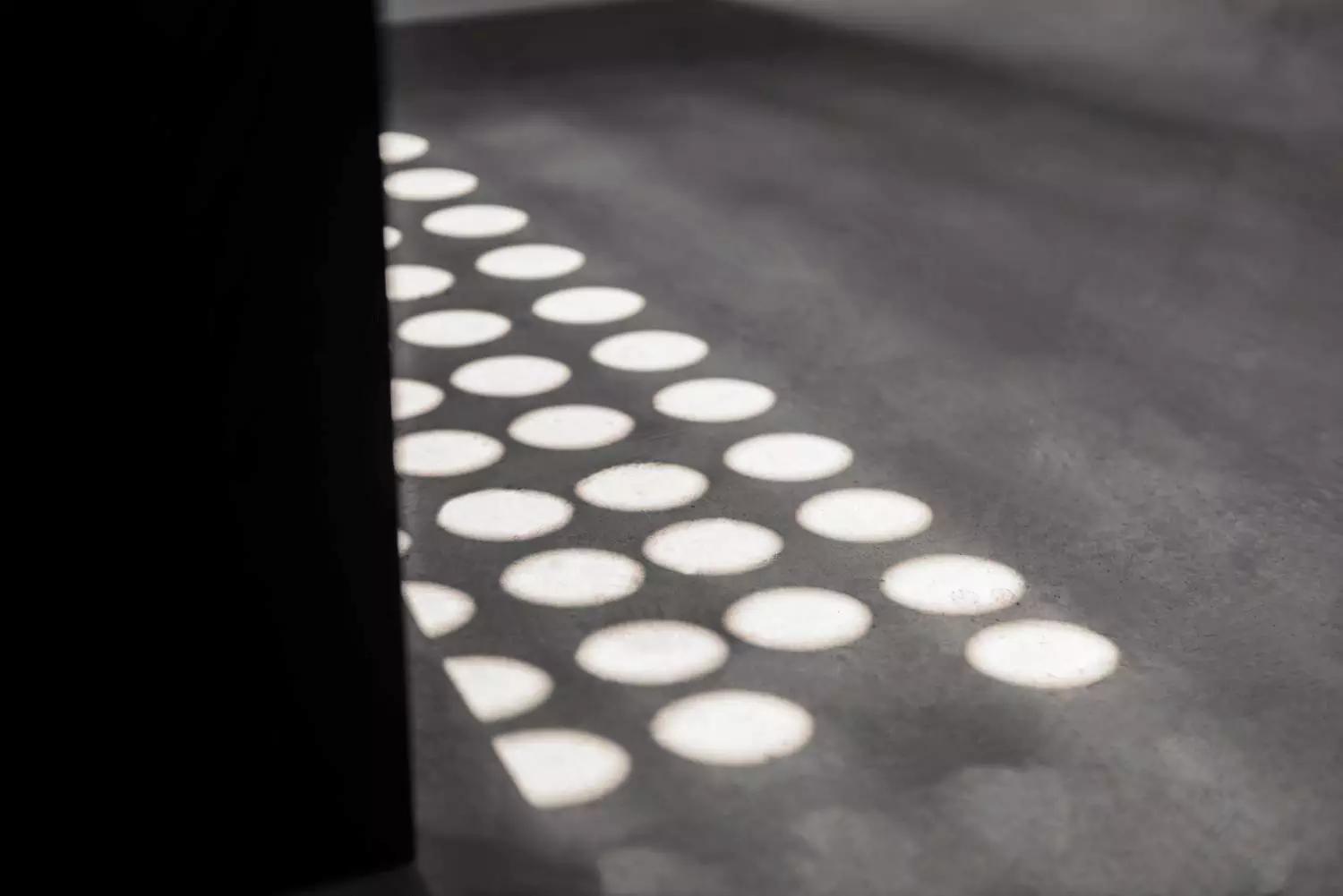 樓頂大小不一的圓孔讓自然光遊蕩在樓梯上,最大限度地借光入室。圓光束如同舞臺的聚光燈,它引導人們聚焦樓梯的肌理細部,也使人隨光前行、探究空間。